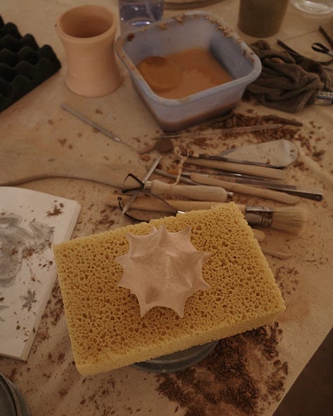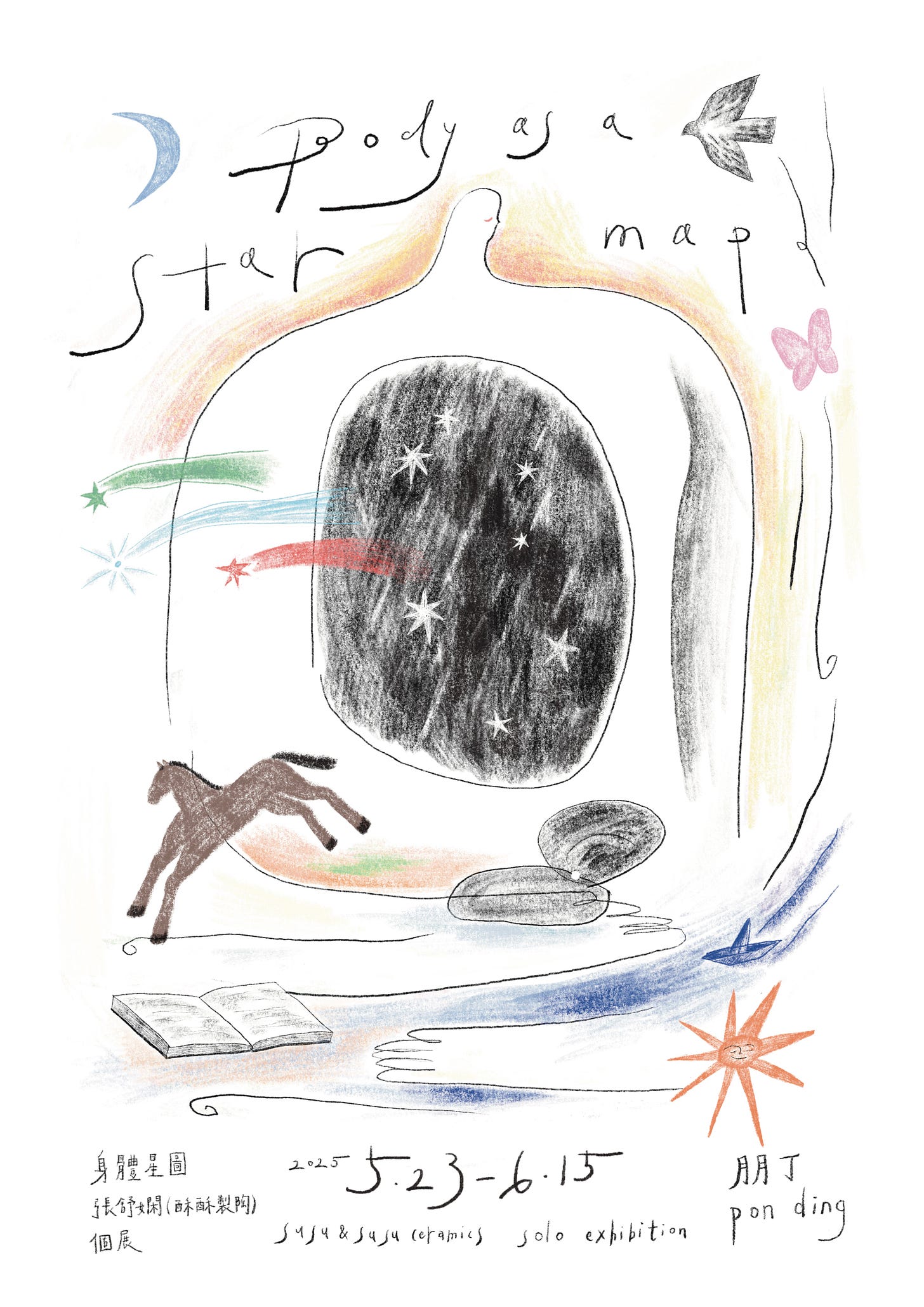 《⾝體星圖》是⼀場從⾝體出發的創作旅程。作品橫跨陶與繪畫,以「拾起」、「安 置」、「包覆」等動作回應記憶與感知的軌跡,構築出⼀張私密⽽流動的地圖。⾝體 既為容器,也是地景,是內在經驗的棲所與測量⼯具。