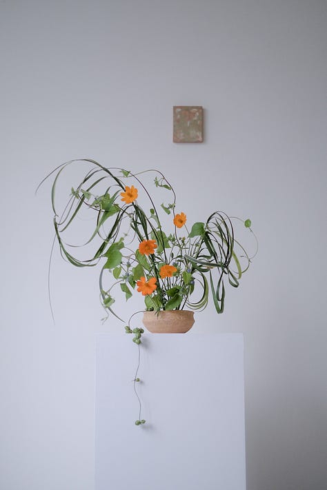 參與者將藉由親自使用花器創作,透過草月流的花藝體驗,進入藝術家的繪畫觀。葉材的撕、捲、折等動作,能創造出不重複的線條; CIZ 所準備的柔軟花材,則能勾勒出心中的繪畫筆觸,透過各種色彩搭配,一期一會地呼應陶作上堆疊的色塊。